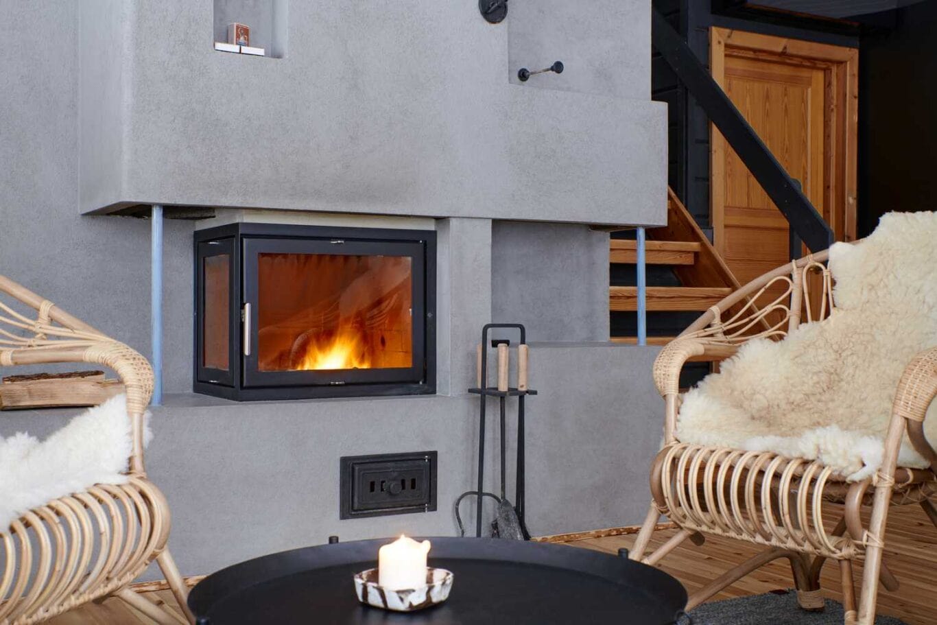 Die offene Küche der Villa Iivari ist komplett ausgestattet. Es ist schön, gemeinsam für die ganze Gruppe zu kochen und gleichzeitig den Schein des Kamins zu genießen. Die Küche hat einen direkten Blick auf Nuuksio National Park.